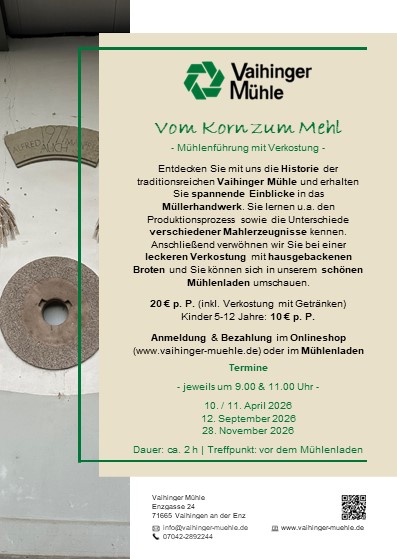 Entdecken Sie mit uns die Historie der traditionsreichen Vaihinger Mühle und erhalten Sie spannende Einblicke in das Müllerhandwerk. Sie lernen u.a. den Produktionsprozess sowie die Unterschiede verschiedener Mahlerzeugnisse kennen. Anschließend verwöhnen wir Sie bei einer leckeren Verkostung mit hausgebackenen Broten und Sie können sich in unserem schönen Mühlenladen umschauen.